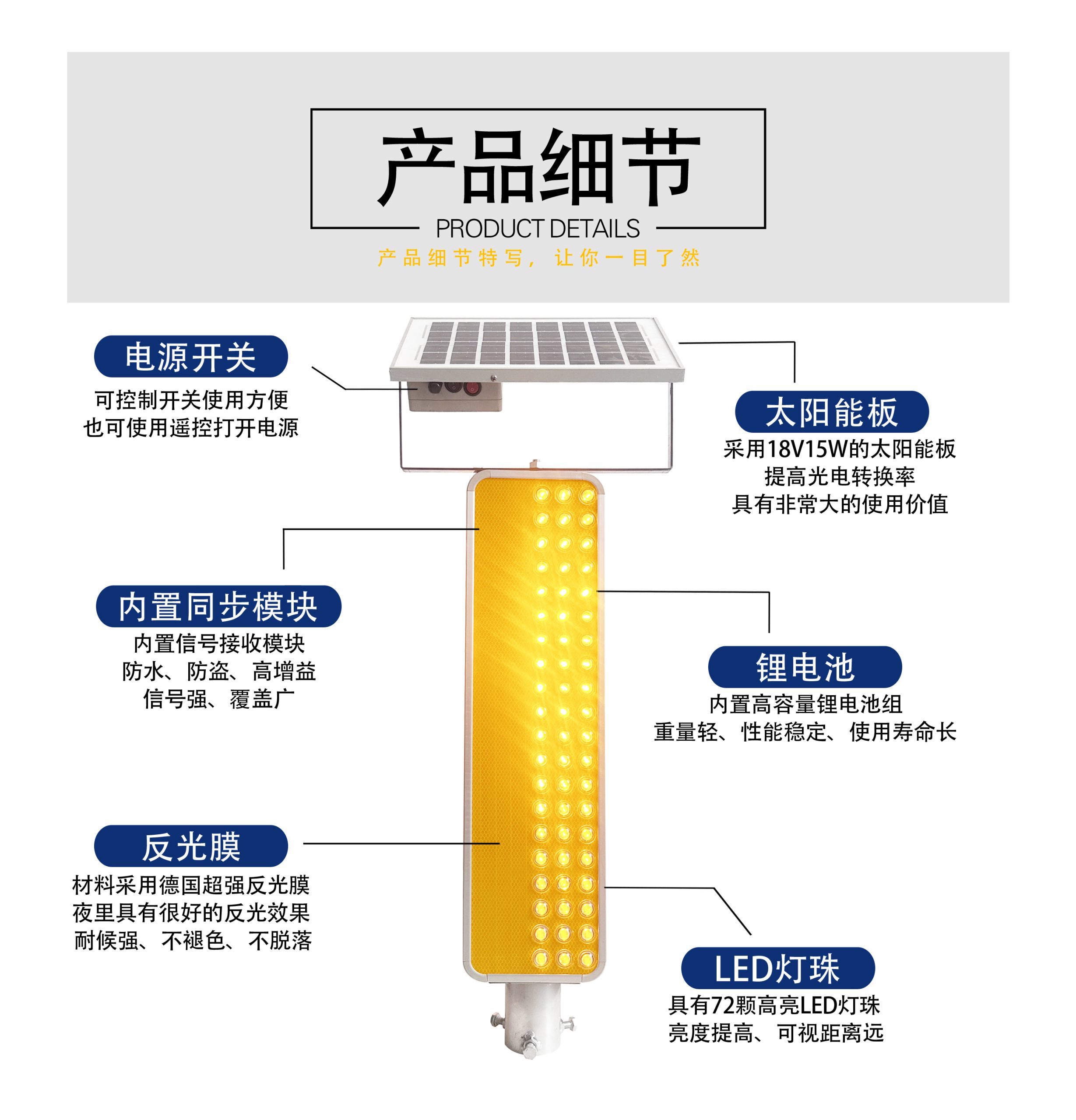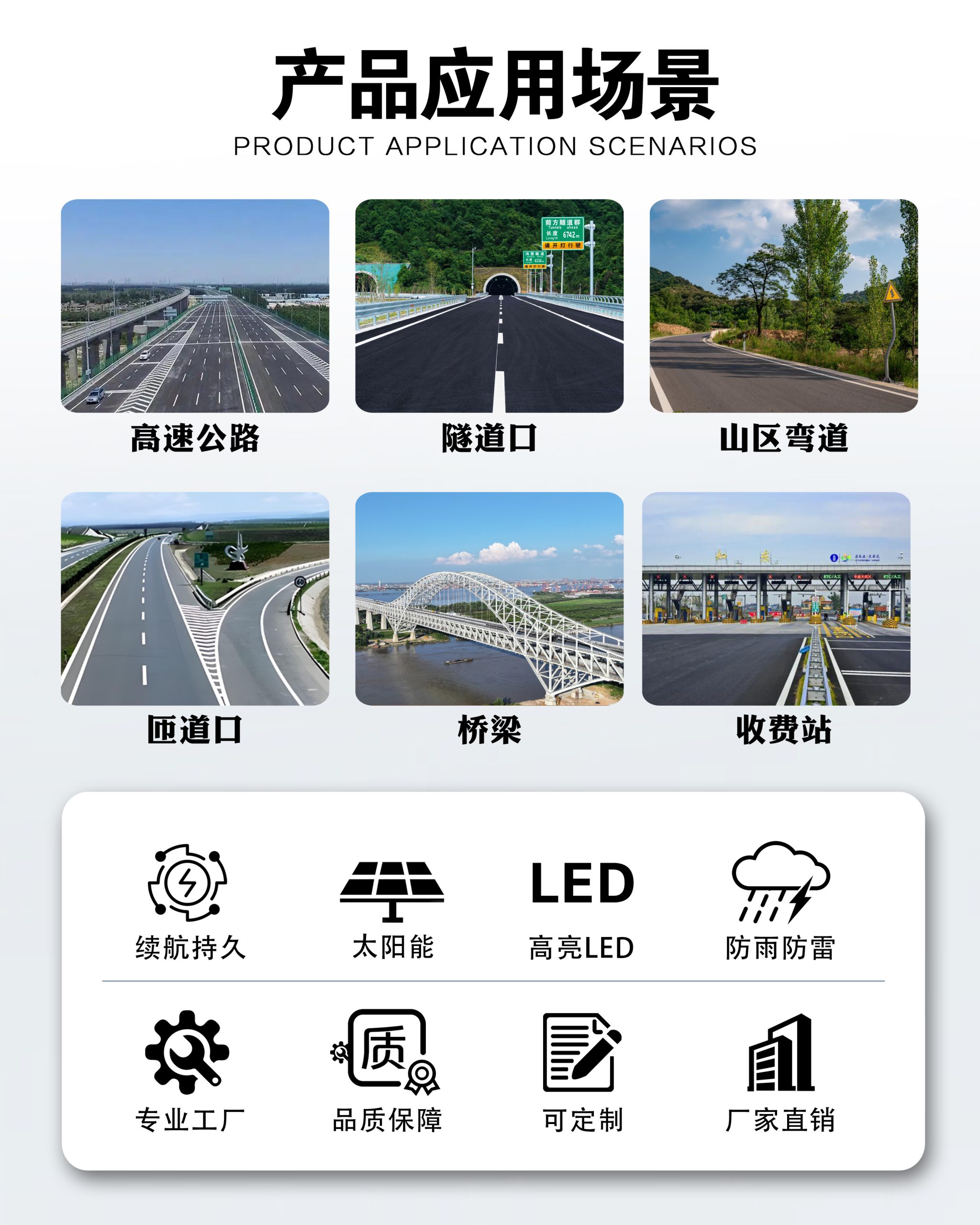 太阳能信号同步警示边缘灯蛀牙主要用于高速公路经常出现团雾的路段。也可用匝道口、隧道口、弯道桥梁等存有安全隐患的危险路段提示司机注意谨慎驾驶,能有效的起到警示作用,避免交通事故和意外事故发生。