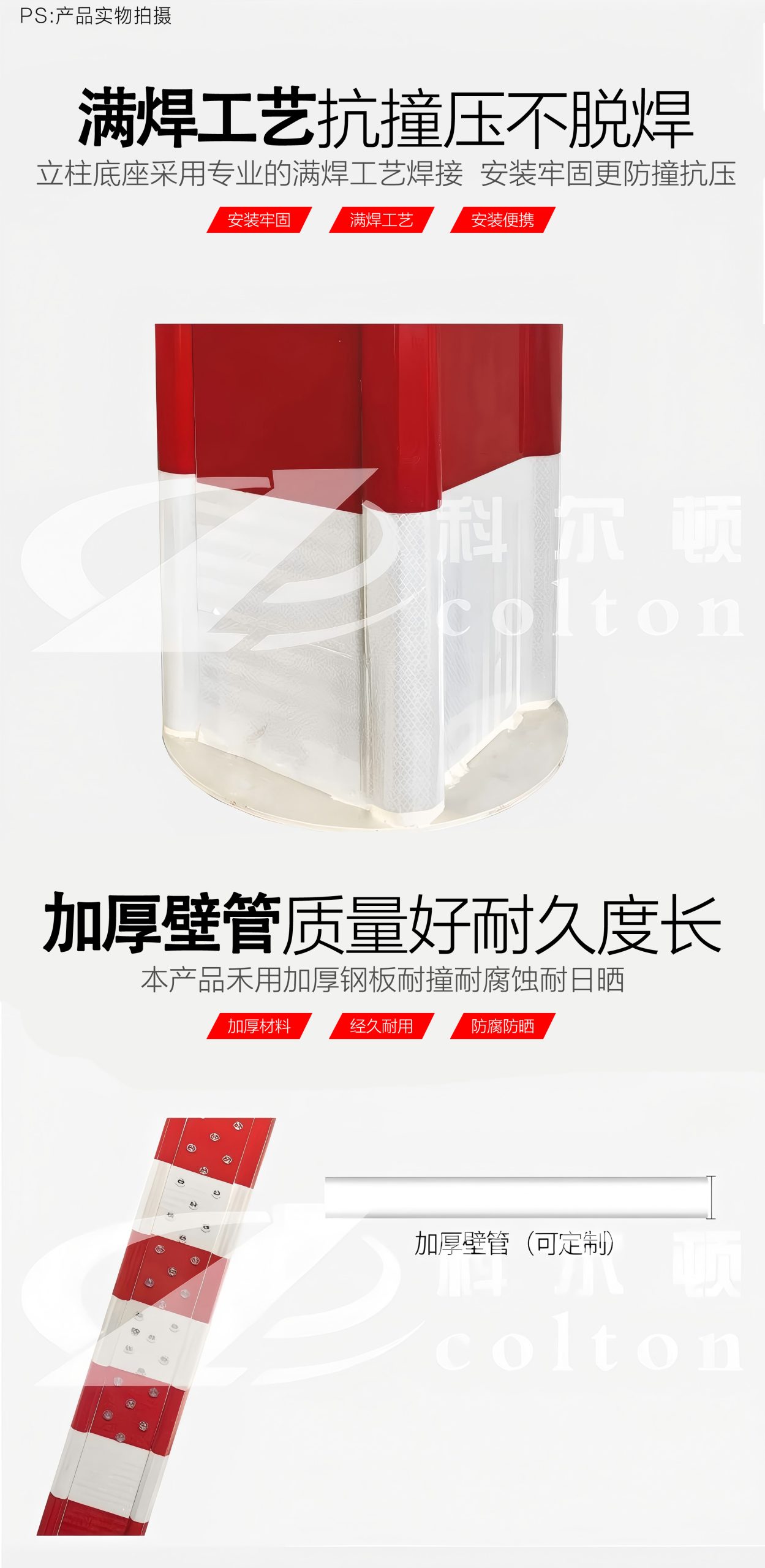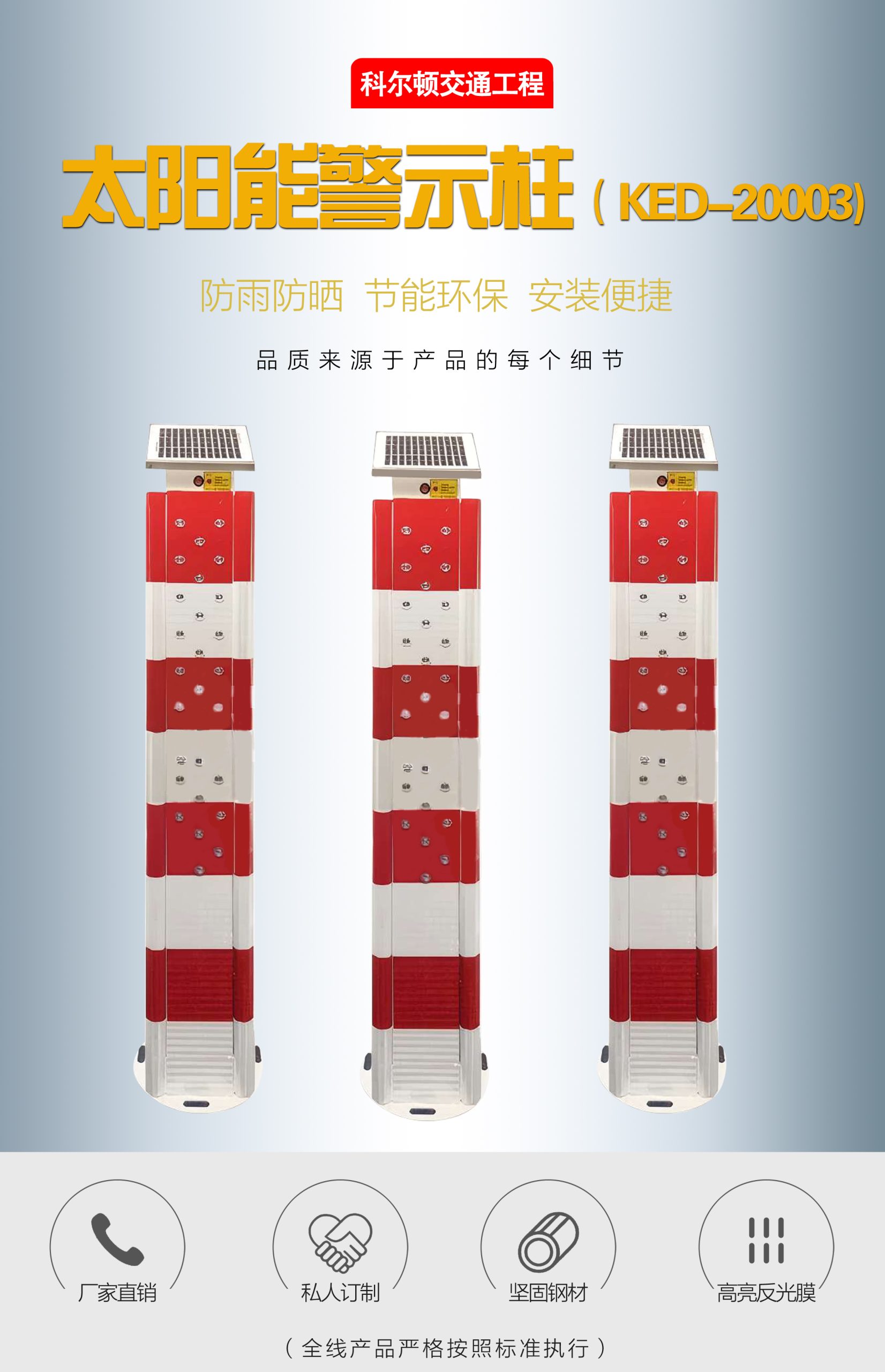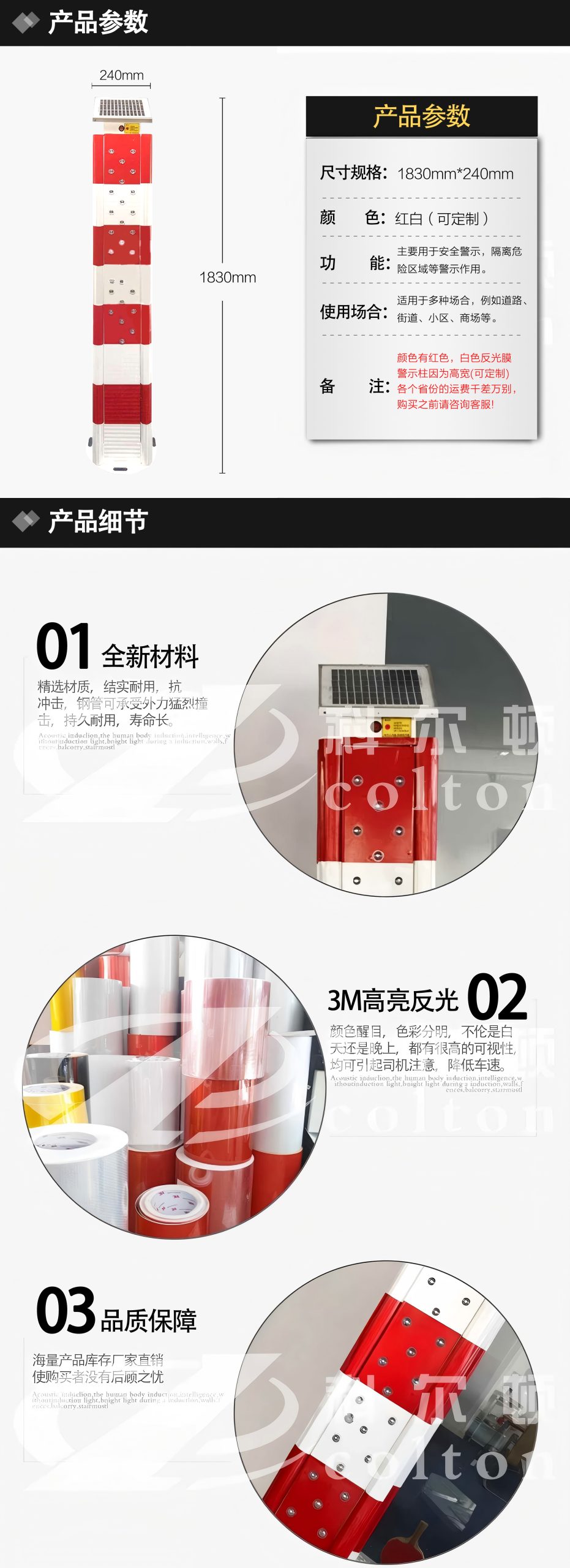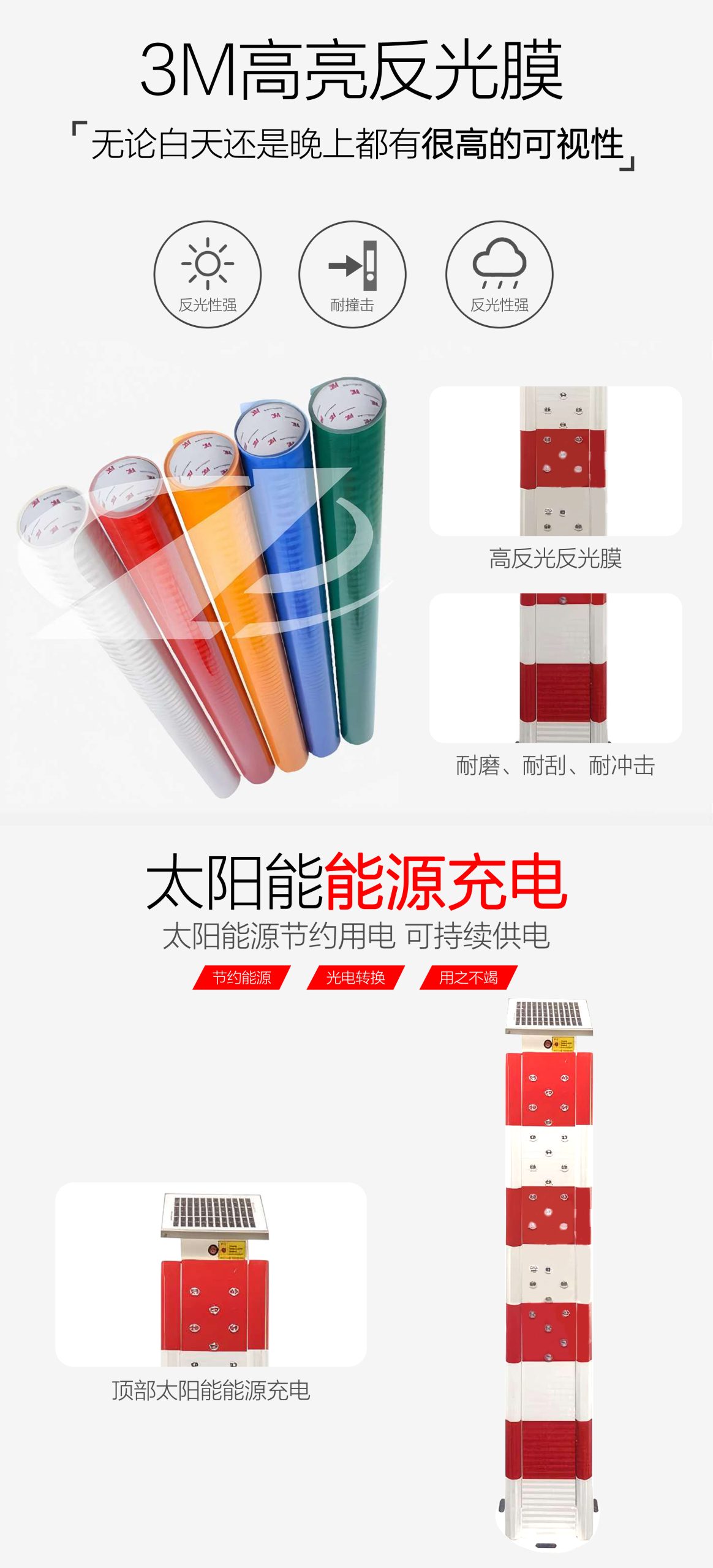 该产品使用高亮反光膜,无论白天还是晚上都有很高的可实现。太阳能能源充电,太阳能源节约用电,可持续供电,节约能源、光电转换、用之不竭。满焊工艺抗撞压不脱焊,立柱底座采用专业的满焊工艺焊接,安装牢固更防撞抗压,安装牢固、满焊工艺、安装便捷。加厚壁管质量好耐久度长,本产品采用加厚钢板耐撞耐腐蚀耐日晒,加厚材料、经久耐用、防腐防晒。