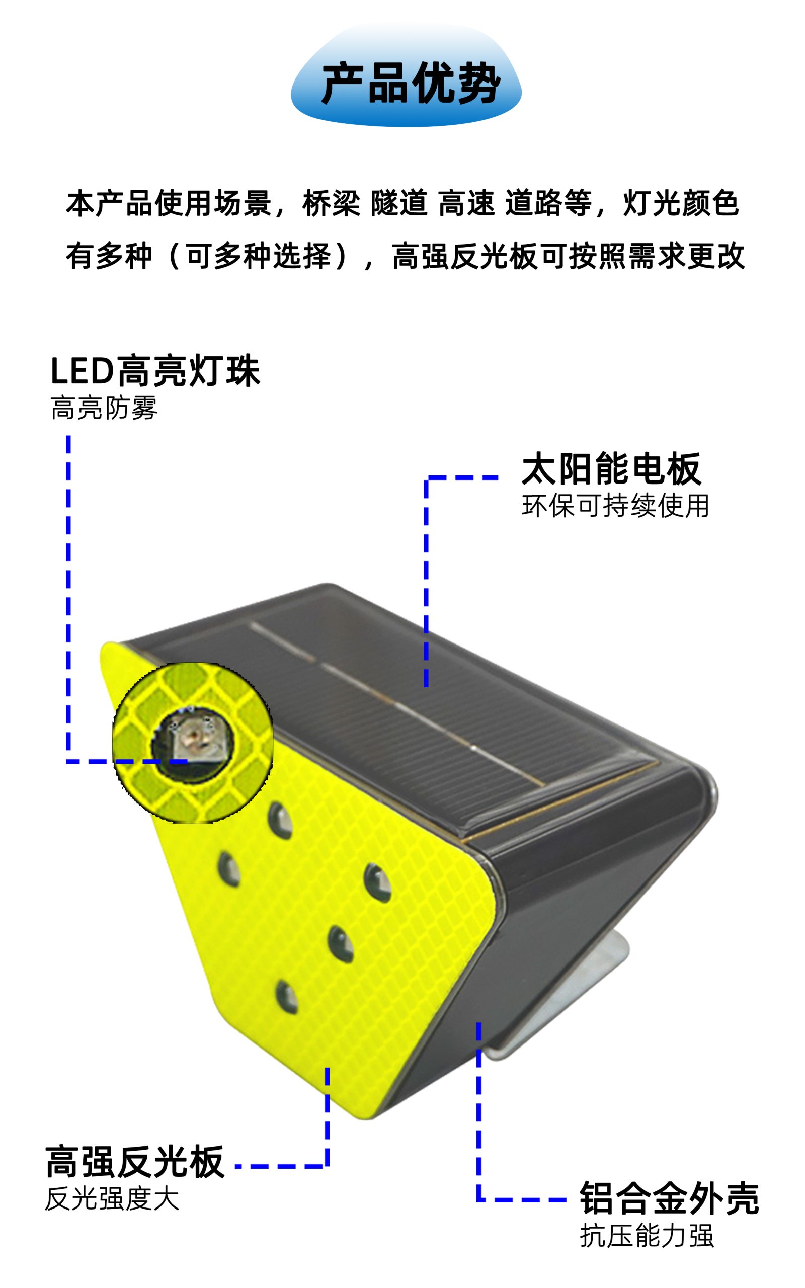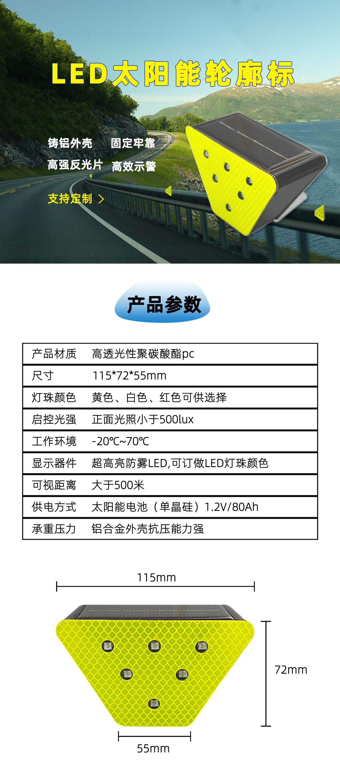 产品材质:高透光性聚碳酸酯po 尺寸:115*72*55mm 灯珠颜色:黄色、白色、红色可供选择 启控光强:正面光照小于500lux 工作环境:-20℃~70℃ 显示器件:超高亮防雾LED,可订做LED灯珠颜色 可视距离:大于500米 供电方式:太阳能电池(单晶硅)1.2V/80Ah 承重压力:铝合金外壳抗压能力强