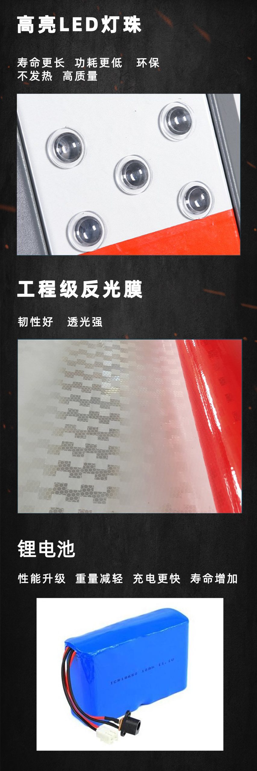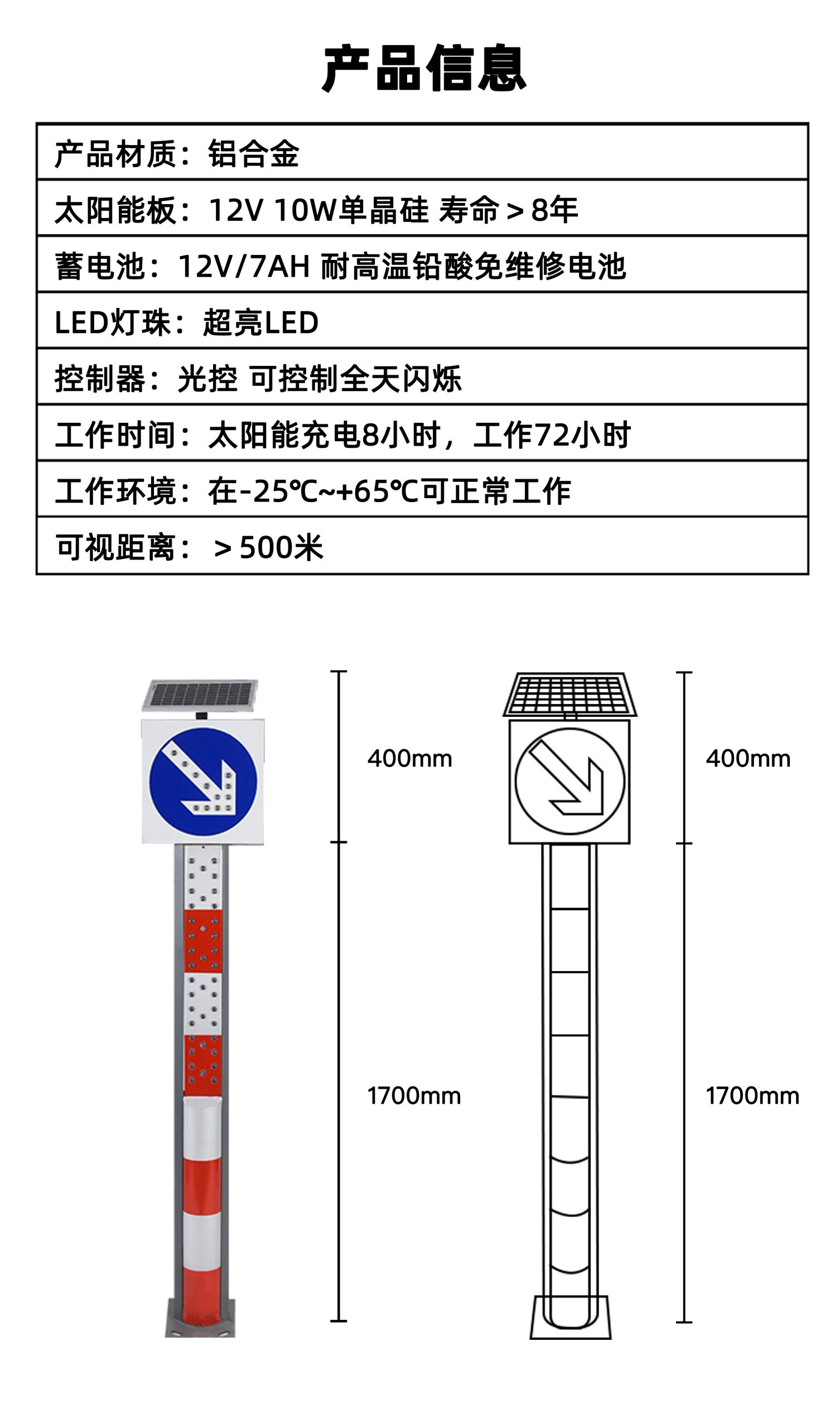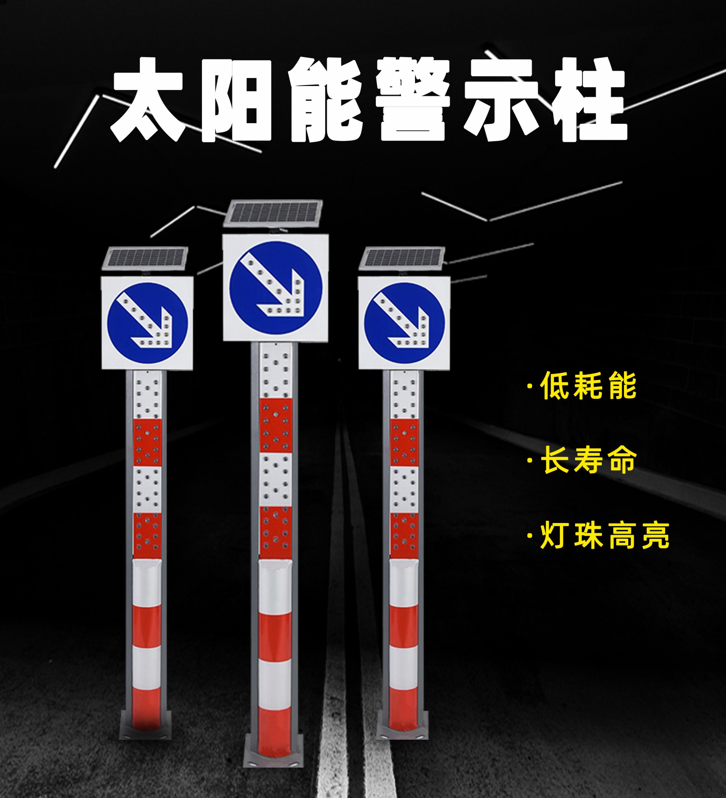 该产品使用高亮反光膜,无论白天还是晚上都有很高的可实现。太阳能能源充电,太阳能源节约用电,可持续供电,节约能源、光电转换、用之不竭。满焊工艺抗撞压不脱焊,立柱底座采用专业的满焊工艺焊接,安装牢固更防撞抗压,安装牢固、满焊工艺、安装便捷。加厚壁管质量好耐久度长,本产品采用加厚钢板耐撞耐腐蚀耐日晒,加厚材料、经久耐用、防腐防晒。