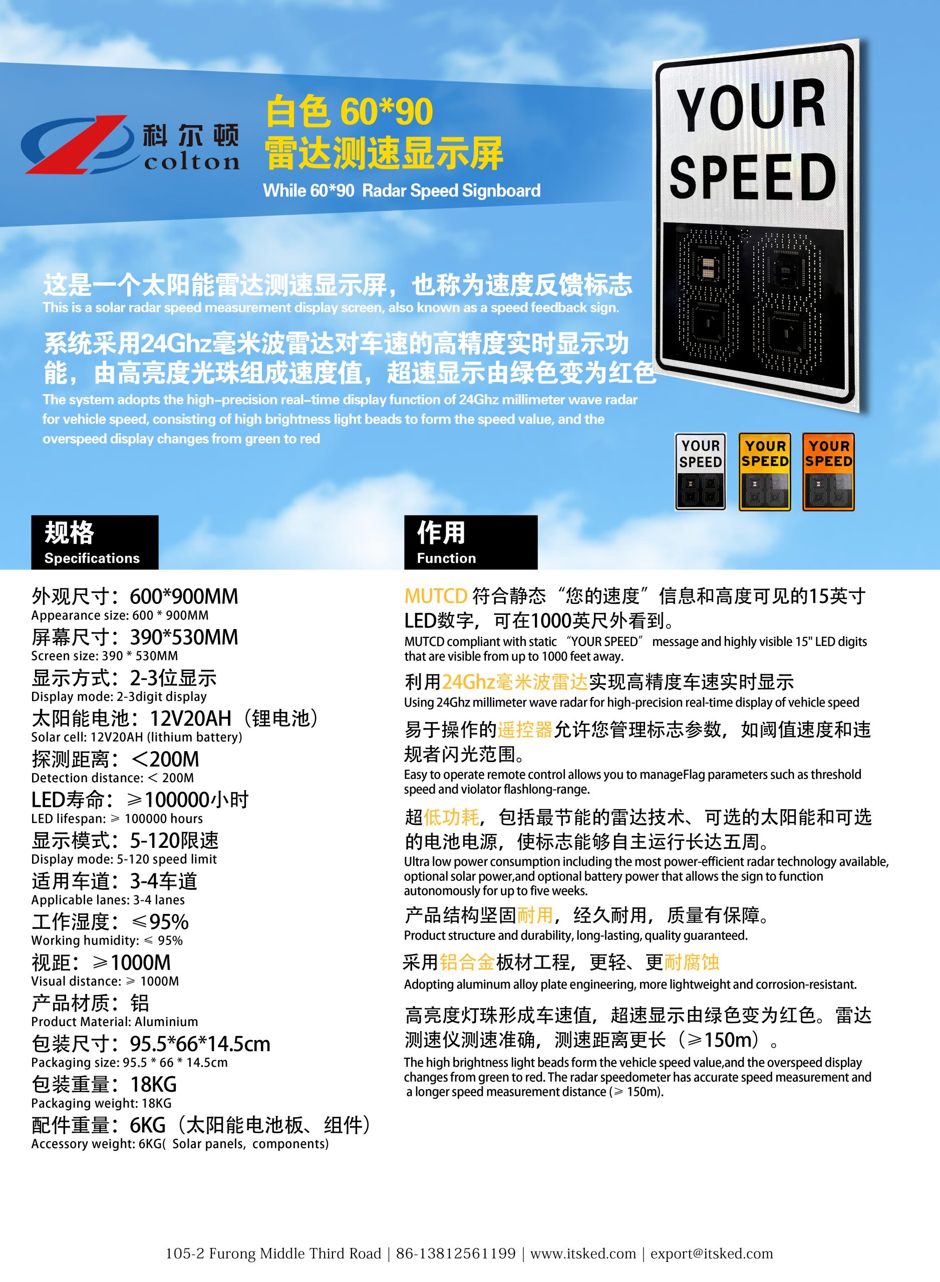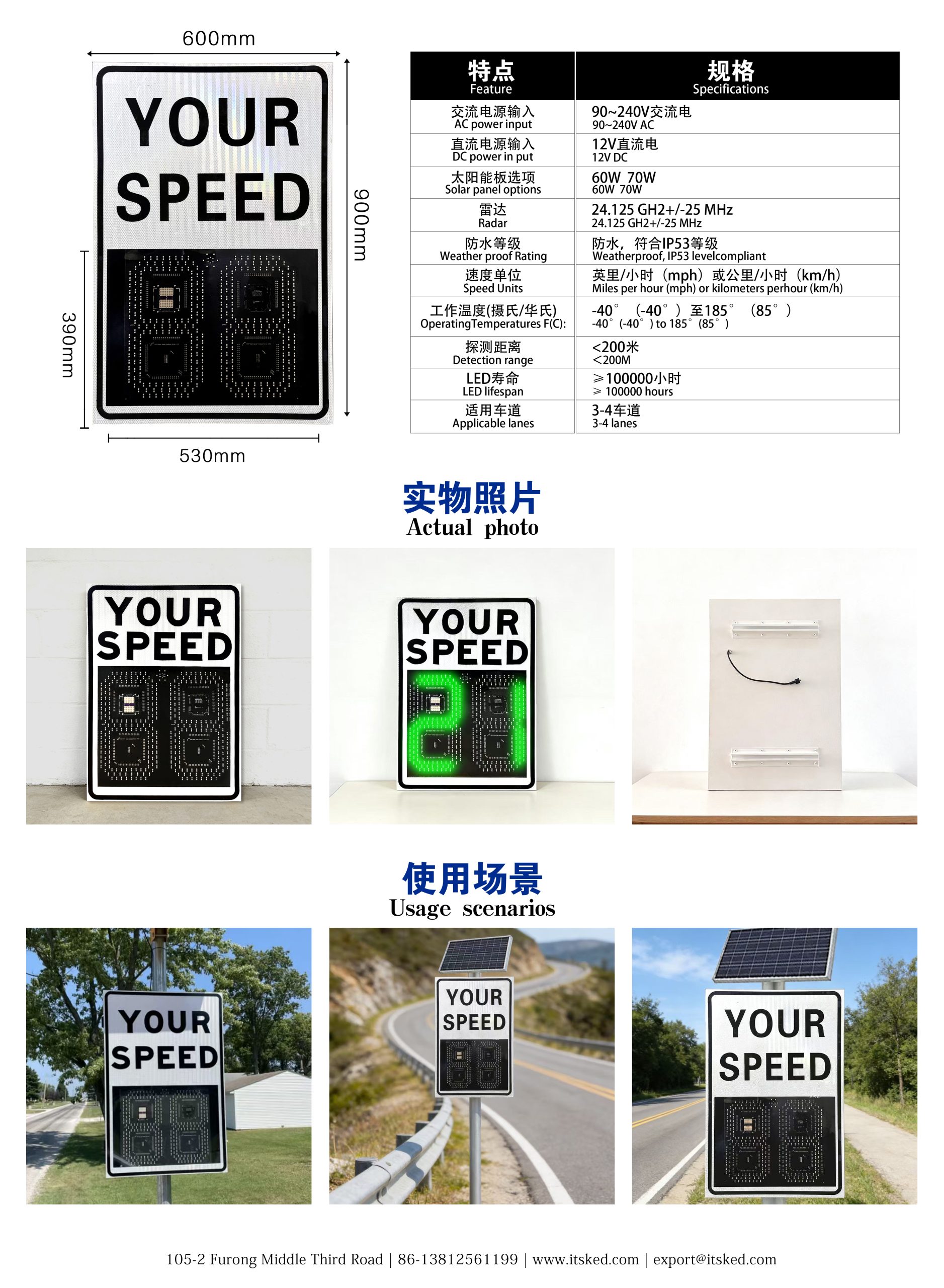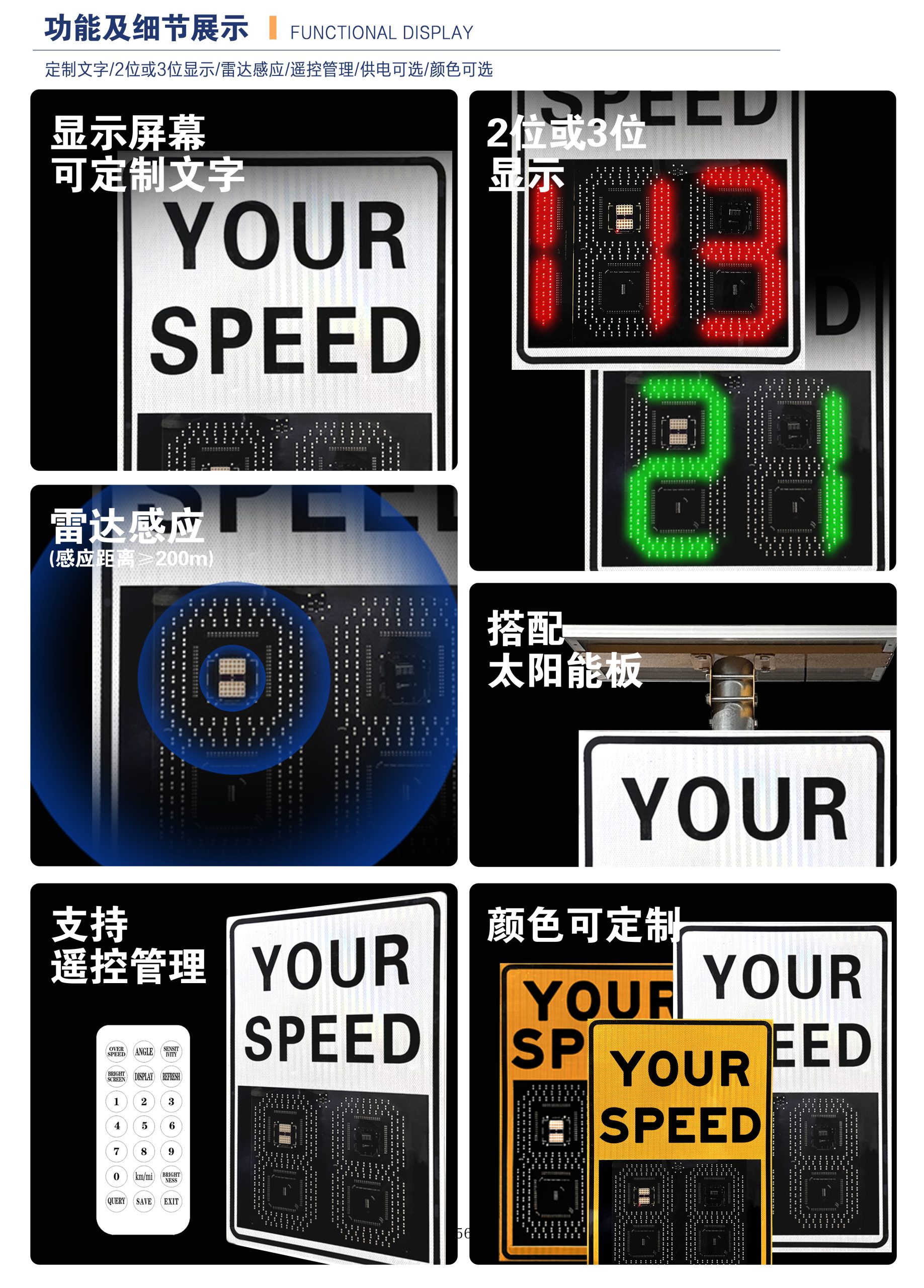 系统采用24Ghz毫米波雷达高精度车辆车速实时显示功能,由高亮灯珠组成车速数值,超速显示由绿转红